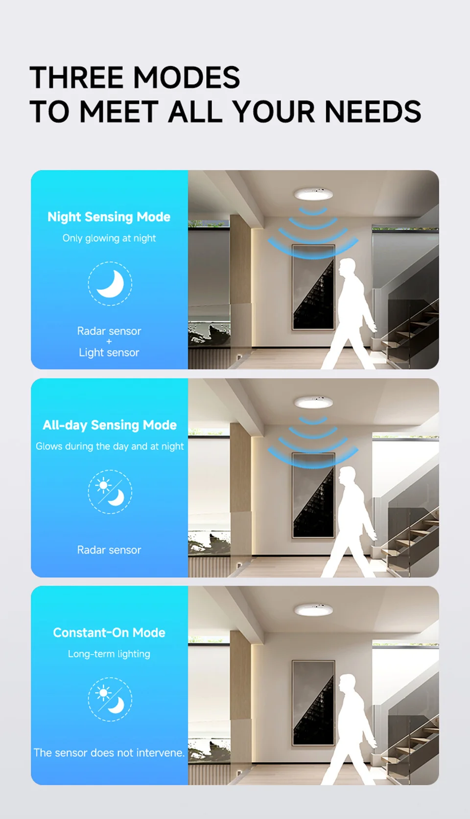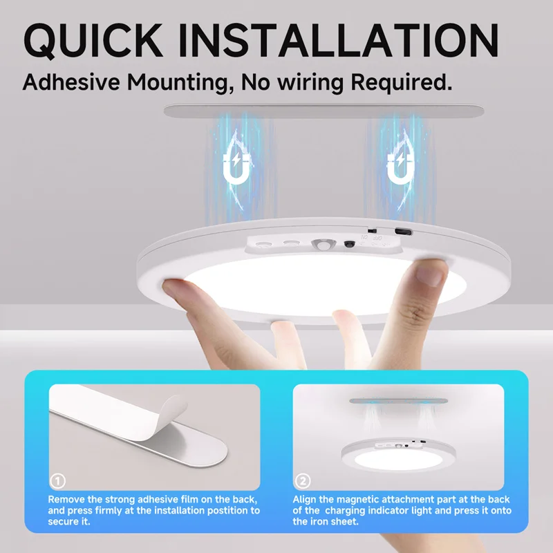 3.【Motion Sensor Auto ON & Remote Control Manually ON】The rechargeable light has two working modes! ① Sensor Mode: the motion sensor light will automatically come on when you are within 9-16 feet and turn off after 20 seconds of movement. ② Stay On Mode: When you need to stay for a long period of time, set the battery ceiling light to ‘ON’ mode and then turn it off with the remote control.