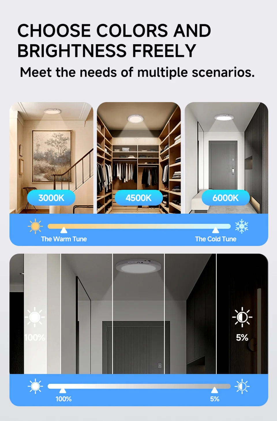 4.【3 Color Temperatures & 400 Lumen Dimmable】This indoor motion sensor light has 3000K warm white/4000K natural light/6000K cool white three colour temperatures to choose from as well as 10 levels of adjustable brightness, which can fully meet all kinds of room lighting needs. Simply use the remote control or the buttons on the light to select your preferred colour and brightness. In addition, the timer function allows the light to switch off automatically after 15/30/60 minutes.
