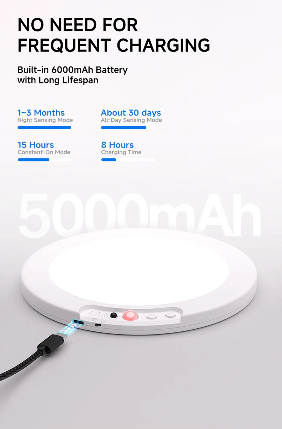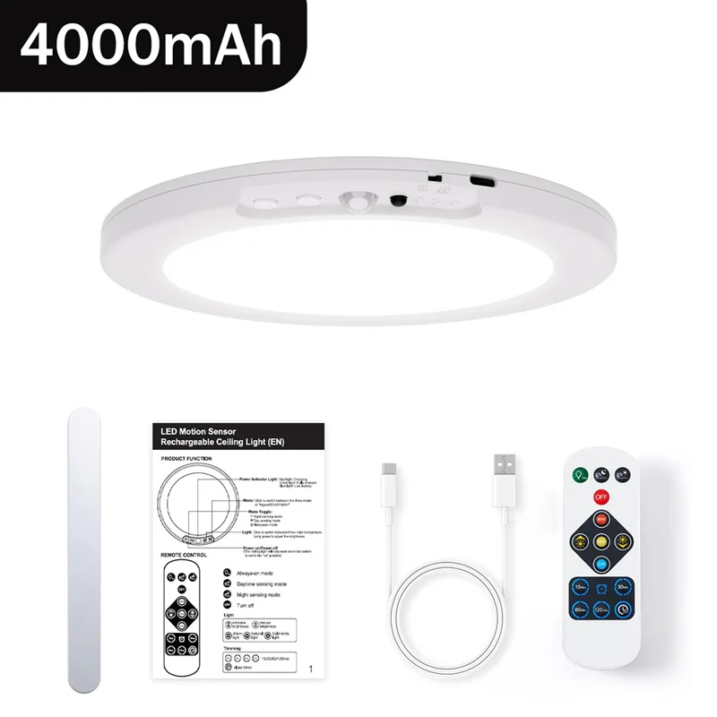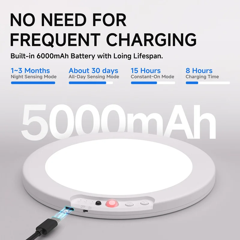 1.【USB Rechargeable & Long Lasting】The rechargeable motion sensor ceiling light is built-in 8000mAh high capacity battery, no need to buy extra batteries. One charge can last 7-10 hours in stay on mode and 30-60 days in motion sensor mode. (Depends on brightness and frequency of use)