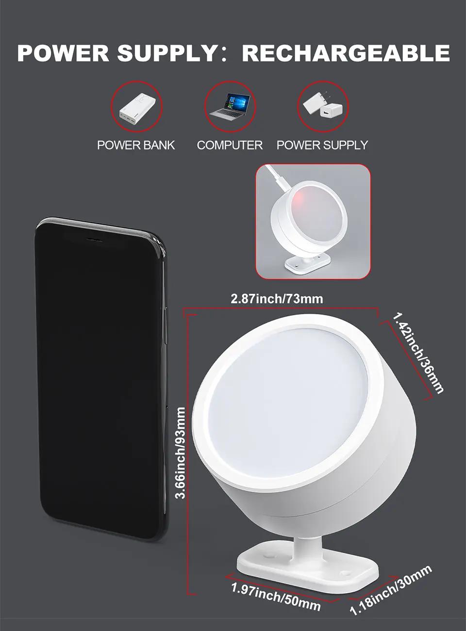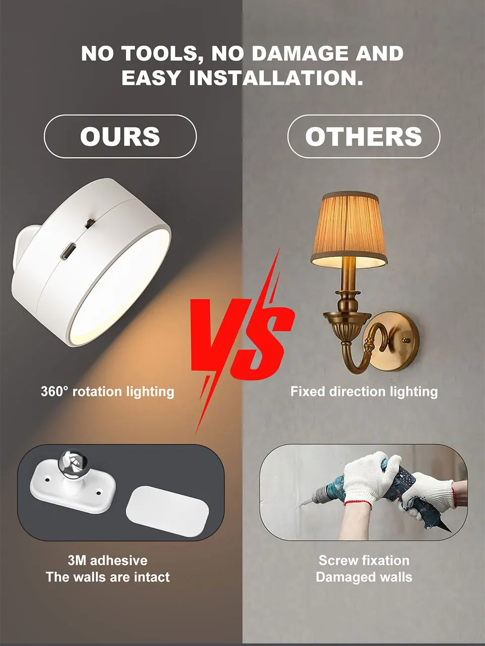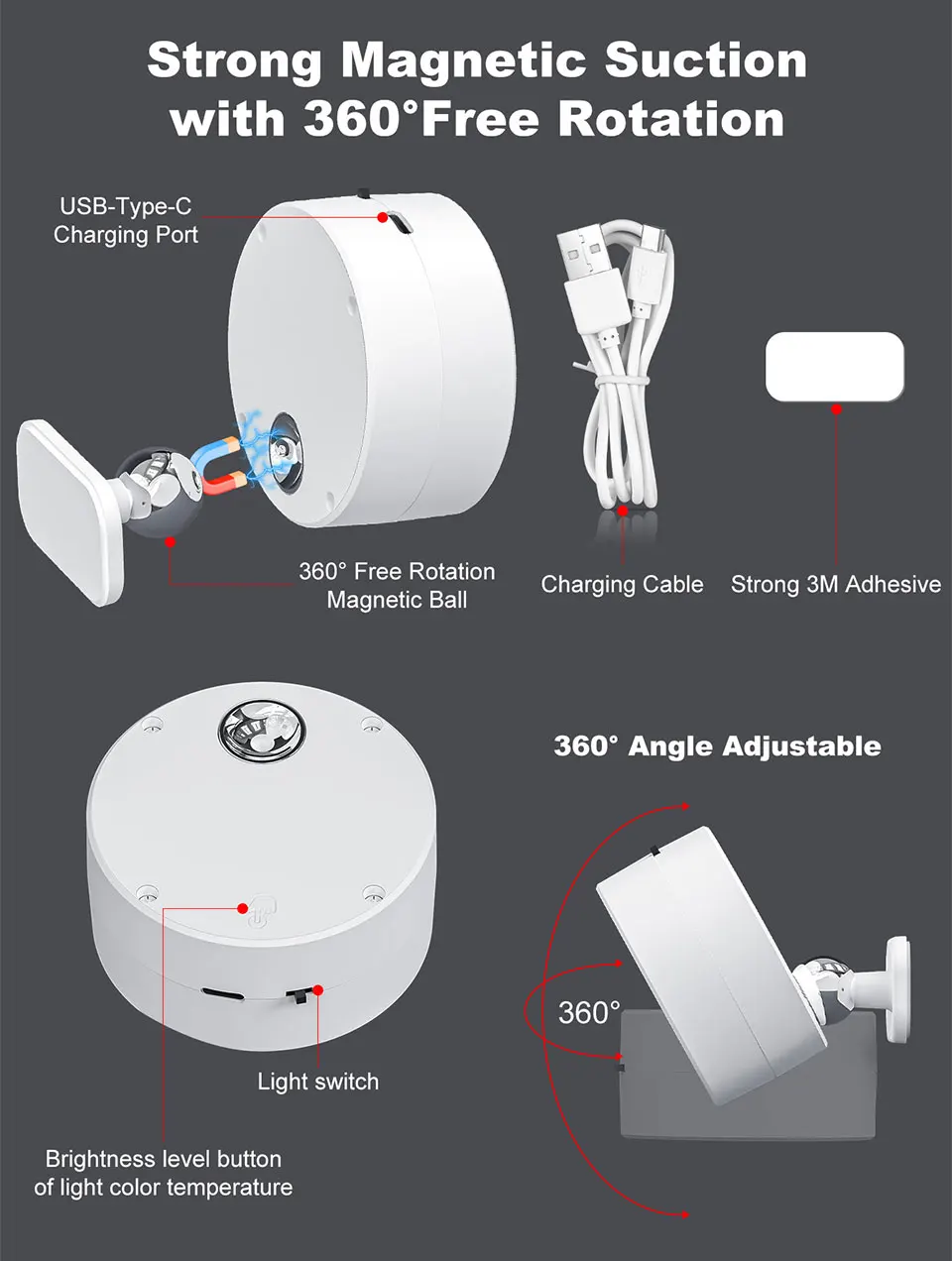 The 360 ° rotating magnetic ball can easily adjust the direction of the light source as needed. Equipped with 3M adhesive, easy to install. Just peel off the adhesive and stick it to the wall. When there is a power outage at home, LED wall lights are very useful as flashlights and easy to carry.