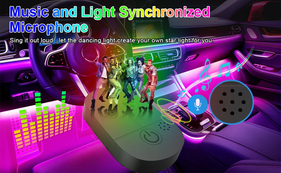 Press the "Music" button on the box, the lights and sounds inside the car will be sync, and the light colors that dance vibrantly to your favorite songs.